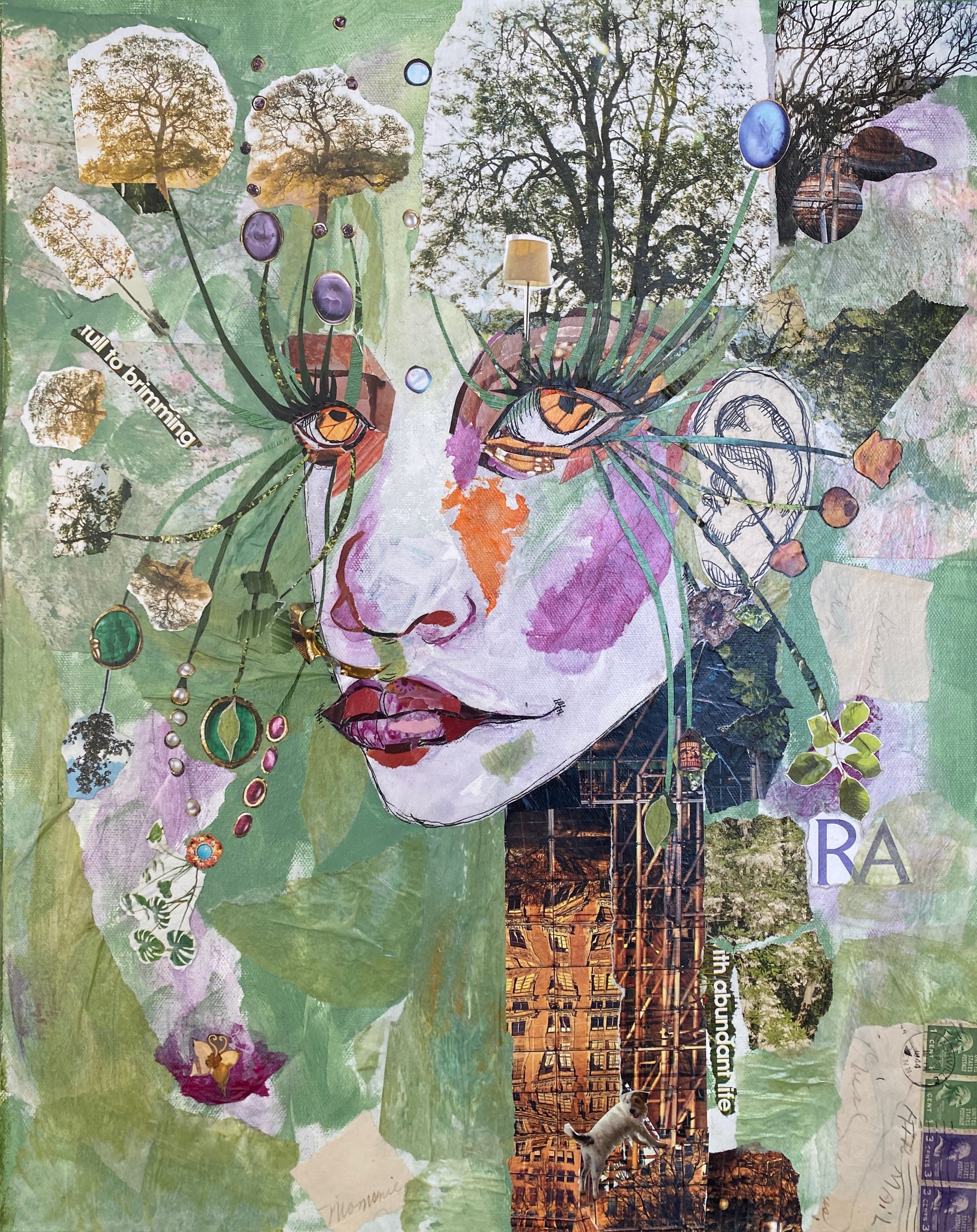 Mixed media collage of a fantasy flower fairy. Made with magazine clippings, painted transparencies, and love letters.