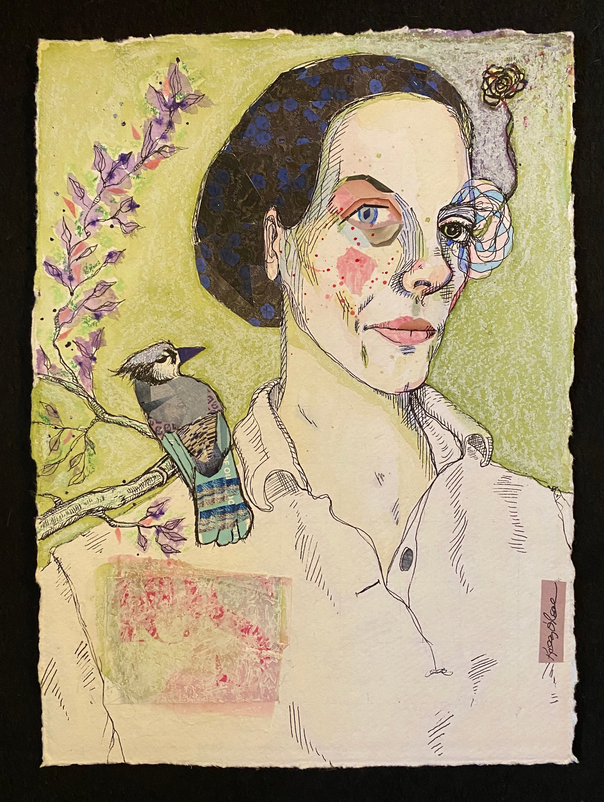 Mixed media image of a woman and her best bird pal, the beautiful blue jay.