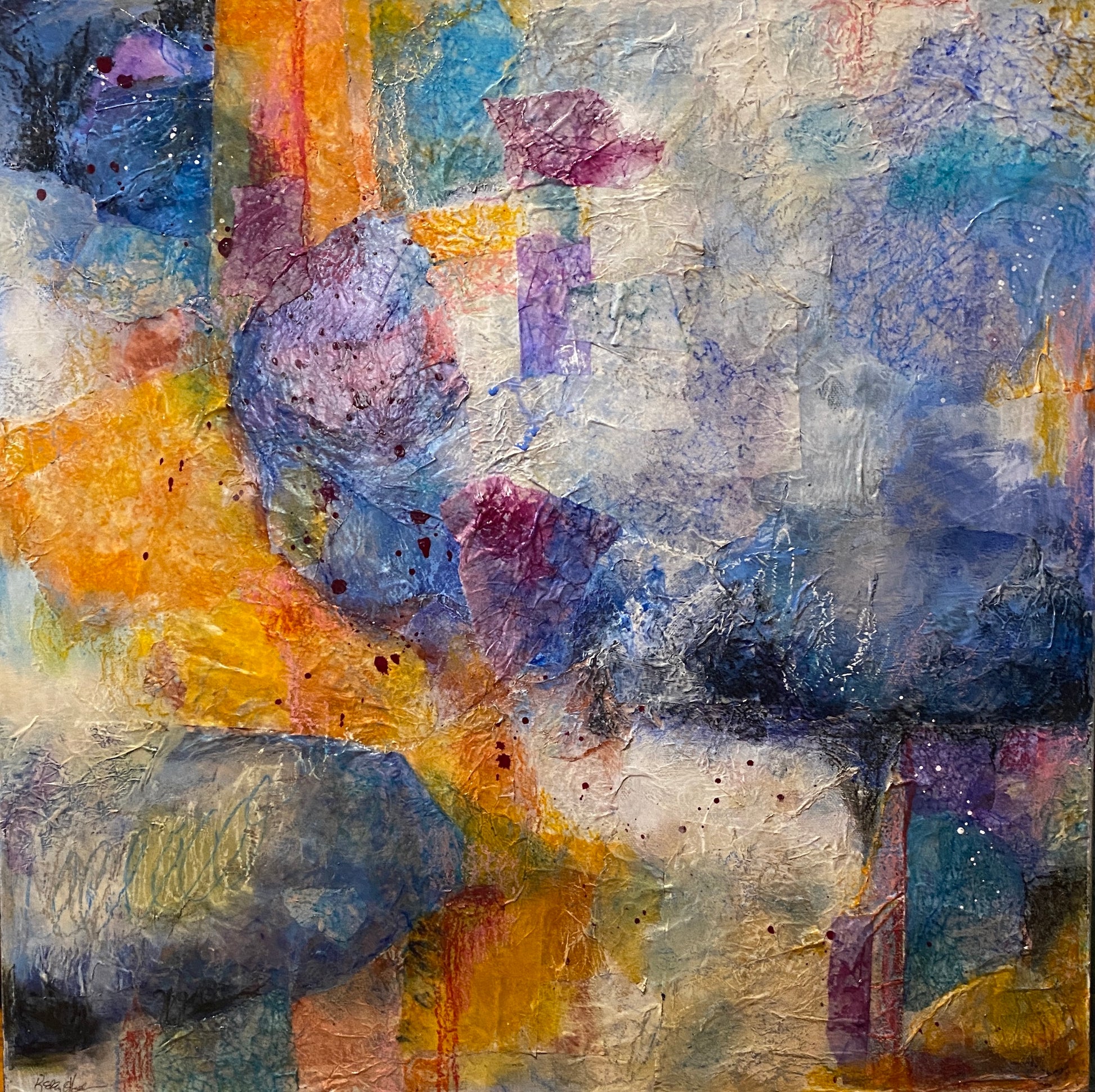 Vibrant blue, purple, and orange 20 x 20 x 1.5 inch mixed media abstract on stretched canvas, suggesting a fantastical space-scape. What we might encounter on the other side of this material world.