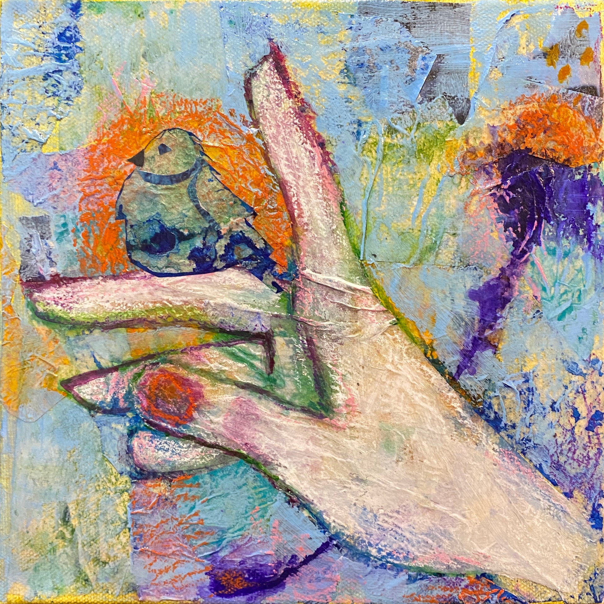 8 x 8 mixed media canvas depicting three friends hanging out in nature. AS NATURE! - human, bird, and flower.